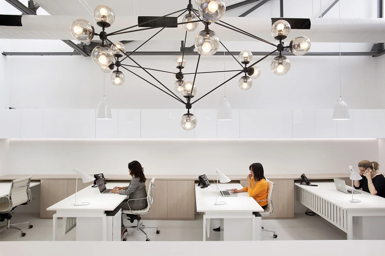 Our Benchwork workstations and globe pedestals paired with Sax chairs perfectly suited the contemporary space and set the mood for the contrasting wood grain storage, high ceilings and amazing pendant light feature.